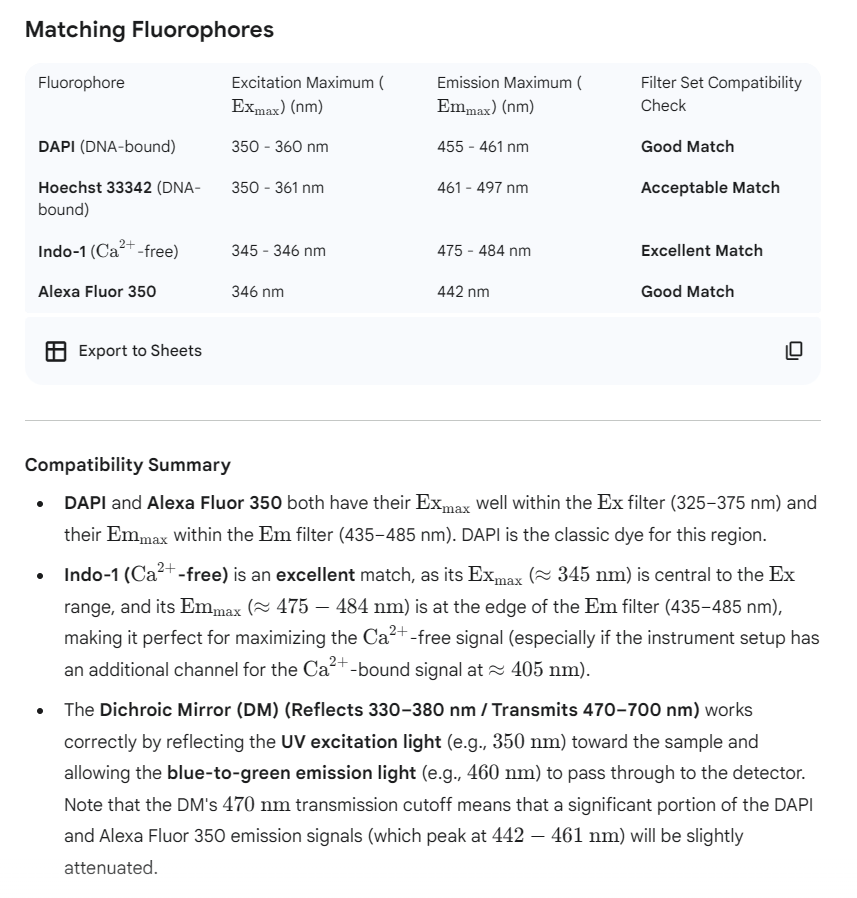 - 여기 필터(Ex): 대역 통과 350/50 nm(T@325-375nm)
