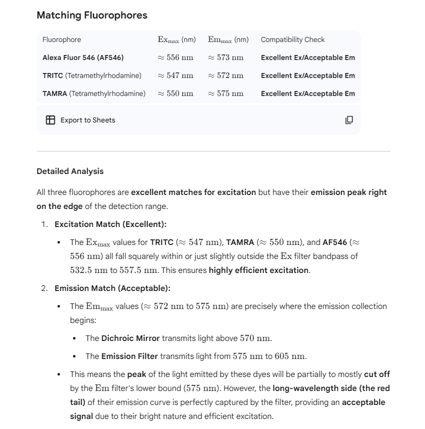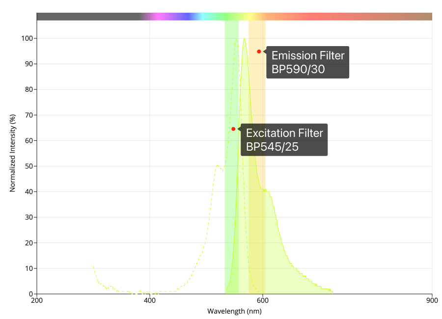 | 형광체 | 유형 | 피크(nm) | 피크 강도 ( 최대 ) | 스필오버(530/30 대역 통과) | 스필오버(575/40 대역 통과) |