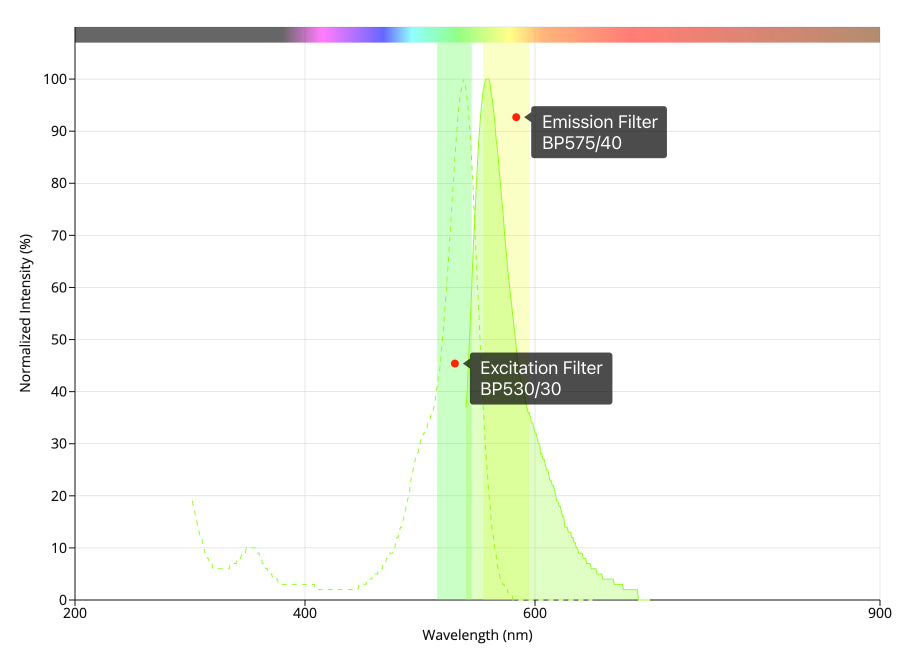 - 방출 필터(Em): 대역 통과 575/40nm(555nm~595nm의 빛을 투과)