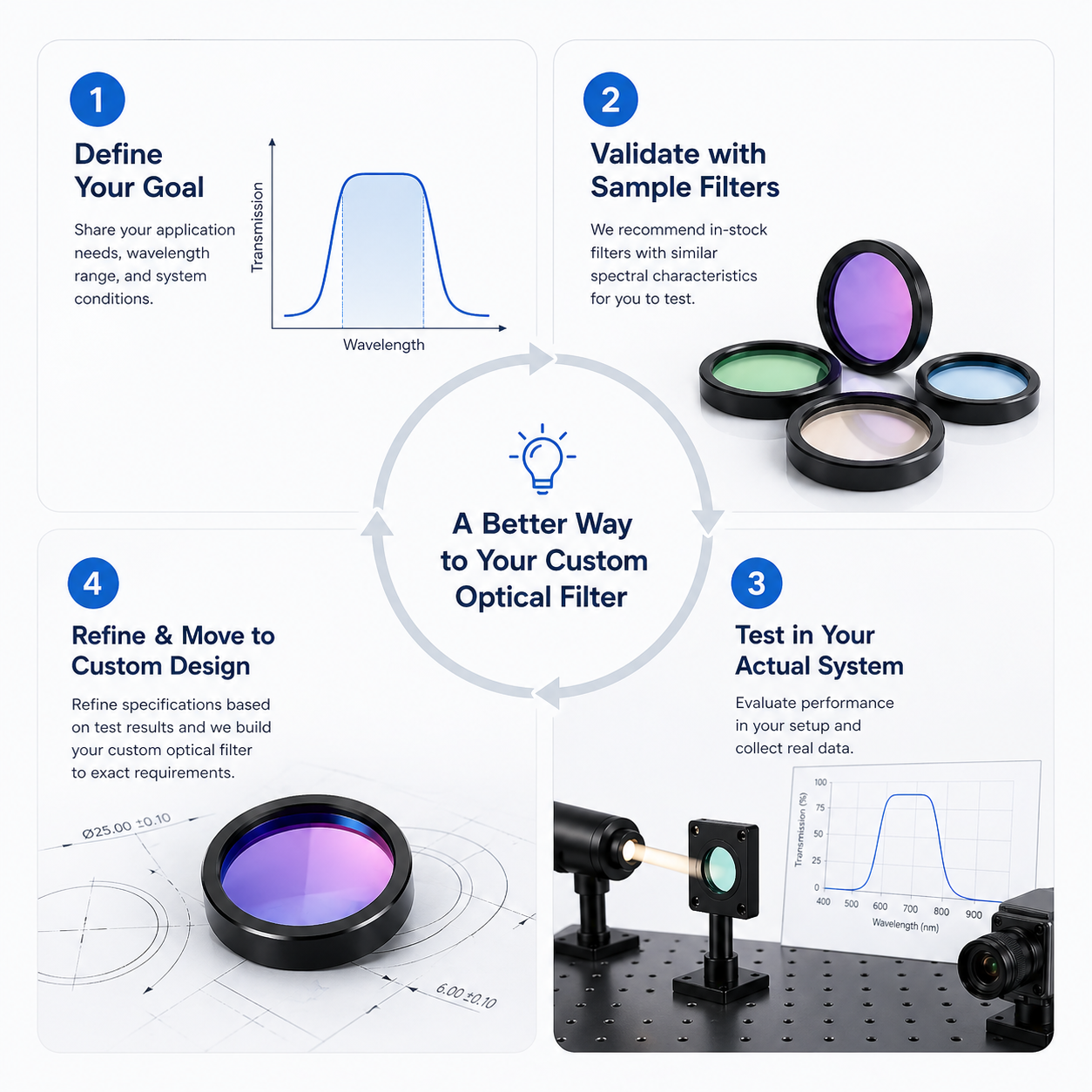 You can start with basic details such as your application, target wavelength or range, light source, and sensor type. Even if your specifications are not fully defined, we can recommend filters for testing.