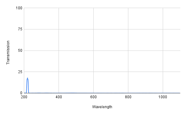 The BP220-15 Bandpass Filter delivers exceptional spectral precision in the deep UV-C spectrum with a center wavelength of 220nm and narrow 15nm FWHM bandwidth. This high-performance deep UV filter is engineered for demanding applications requiring precise wavelength isolation in the far UV-C region, where spectral accuracy and minimal crosstalk are critical for optimal results.