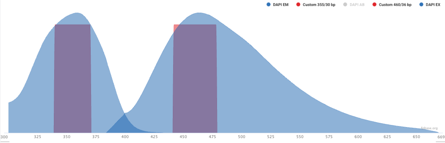 - Excitation Filter (Ex): Bandpass 335/30 nm (transmits light from 320 nm to 350 nm)